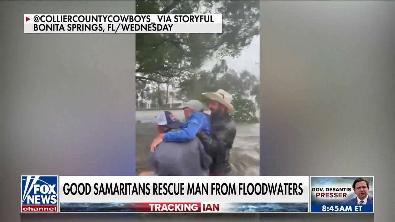 A group of Good Samaritans called the “Collier County Cowboys” saved an elderly man from his vehicle just before it was submerged by floodwaters from Hurricane Ian.